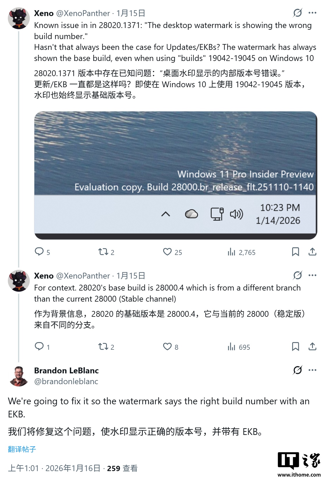 LeBlanc 回应称微软计划在近期通过推送一个“启用包(Enablement KB,简称 EKB)”来彻底解决这一问题。LeBlanc 强调,新的 EKB 将修正水印的读取与显示逻辑,使其能够直接展示正确的、完整的构建版本号。IT之家附上相关截图如下: