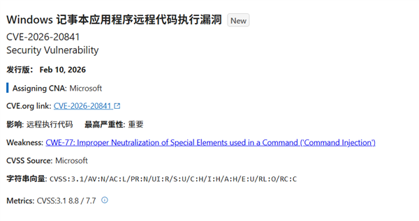 快科技2月12日消息,近日,微软发布安全警告,披露了Windows系统自带的记事本存在一项安全漏洞(CVE-2026-20841)。